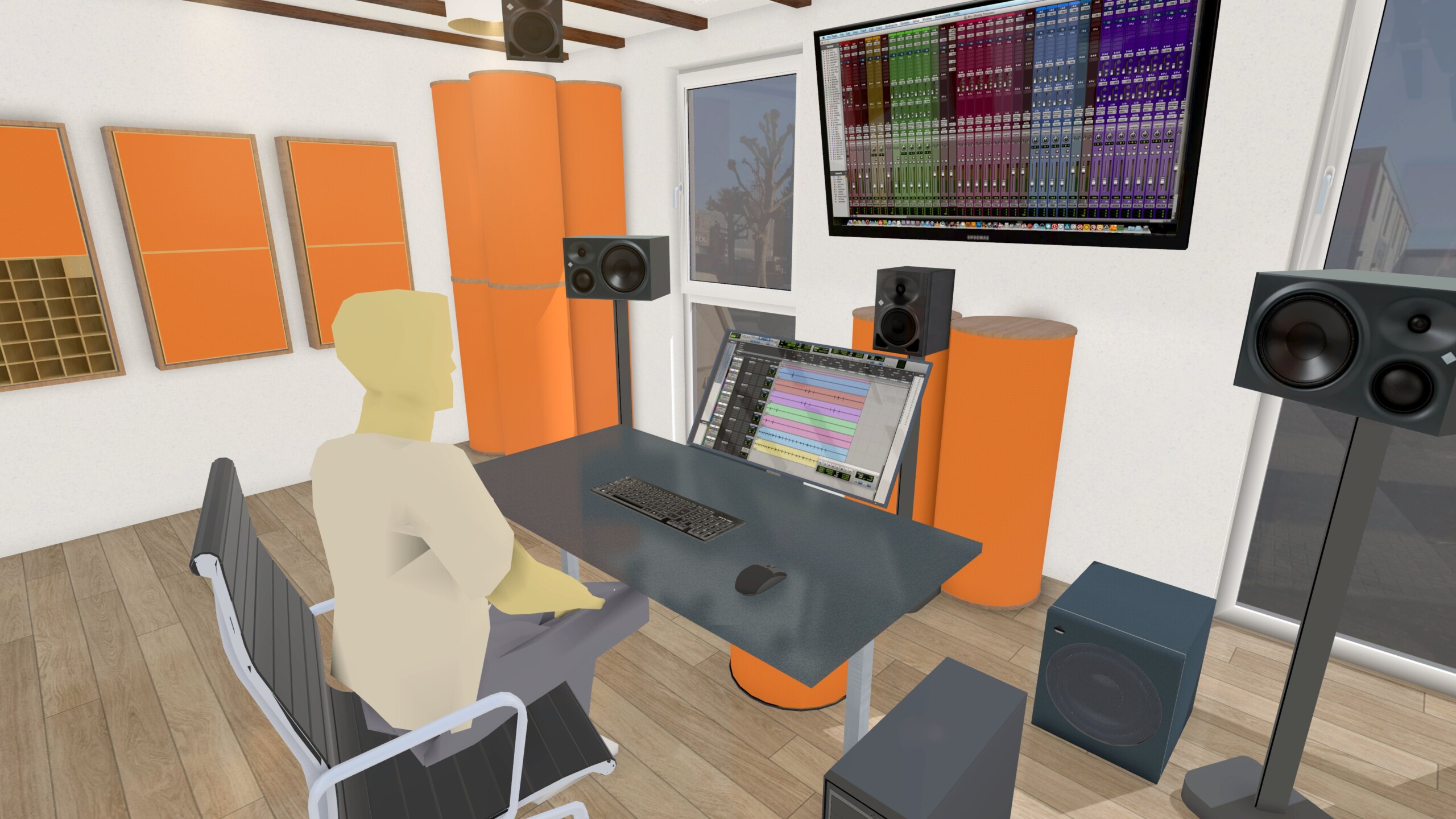 Parallel dazu sind wir gerade mitten in der Entwicklung unseres neuen Themenkurses „3D-Audio“. Die neue Regie soll unseren Tutoren zur Erstellung von Klangbeispielen dienen und steht neben dem Studioalltag auch für Schulungszwecke am HOFA-College zur Verfügung. Außerdem wird die Regie im Sommer im Rahmen unserer Gratis Workshop Days eingesetzt – so können Kursteilnehmerinnen, Kursteilnehmer, sowie Interessierte den Raum und das Setup auch vor Ort bei einigen Workshops erleben.