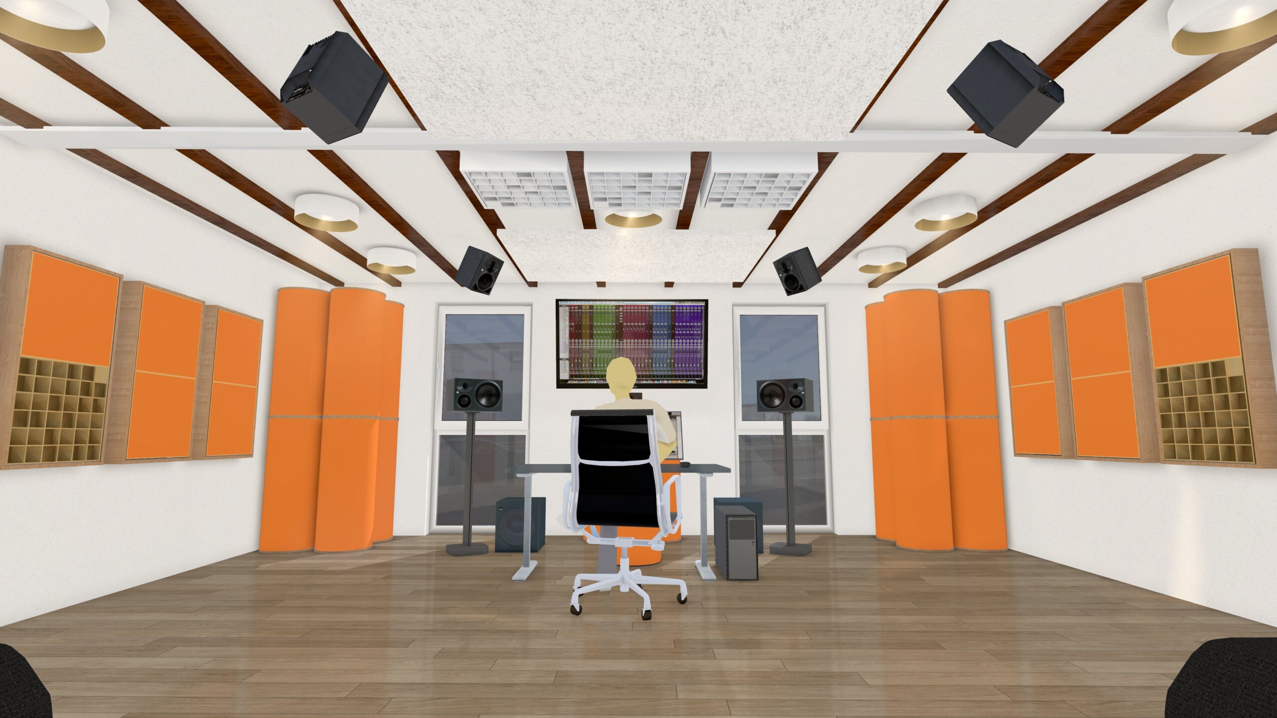 Vor diesem Hintergrund entstand die Idee, die bestehende Regie nicht einfach nur zu erneuern, sondern neu zu denken. Geplant ist eine 3D-Audio-Regie, die gleichzeitig multifunktional genutzt werden kann – sowohl für klassische Atmos-Anwendungen als auch für Videoformate, Workshops und Stereo-Mischungen. Der Raum soll außerdem für die Entwicklung unseres neuen Themenkurses „3D Audio“ genutzt werden. Hier werden dann unter anderem Klangbeispiele und praxisnahe Inhalte produziert, die später unseren Fernkursteilnehmer:innen am HOFA-College zur Verfügung stehen.