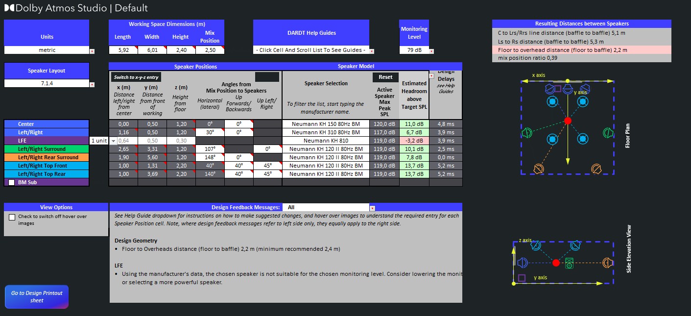 Markus Ziegler von der Firma Dolby stellt uns mit „DARDT“ ein bewährtes Tool zur Planung der Lautsprecher-Positionierung zur Verfügung. DARDT ermöglicht es, den Raum innerhalb der Dolby-Vorgaben zu optimieren. Für Schulungszwecke am HOFA-College ist uns ein möglichst breiter Sweetspot wichtig, was wir hiermit optimal vorbereiten können.