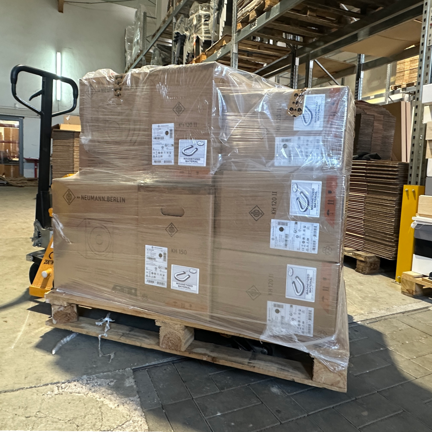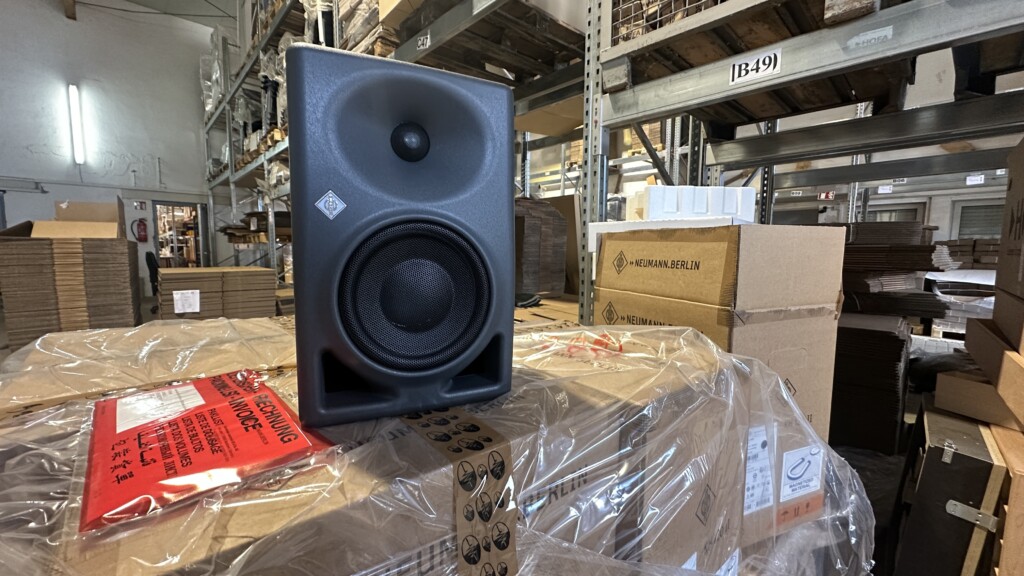HOFA Geschäftsführer Jan Bönisch nimmt bei der finalen Übergabe die baulichen Maßnahmen ab. Zeitgleich trifft die erste Lieferung von Neumann ein. Bis zur Montage werden die Lautsprecher noch einige Wochen im HOFA Lager untergebracht.